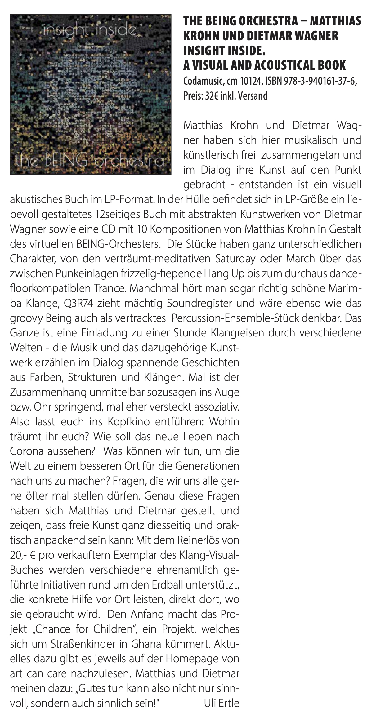 Das visuell-akustische Buch INSIGHT INSIDE mit zehn Musikwerken des Lübecker Schlagzeugers Matthias Krohn und zehn Bildern des Schleswiger Malers Dietmar Wagner ist modelliert als LP-Hülle. Darin befinden sich anstatt einer Langspielplatte eine Audio-CD und eine aufwendig gestaltete zwölfseitige Einlage mit den Kunstwerken. Die Musik, eine komplexe multistilistische Verschmelzung unterschiedlichster Einflüsse, beschreibt der Musiker mit den Worten: „Ich schreibe keine Stücke, ich erfinde Geschichten, die aus meiner langjährigen Arbeit und Erfahrung mit diversen musikalischen Genres entstehen.“ Wie der Soundtrack eines Films verwandelt das virtuelle BEING Orchester diese Geschichten in Töne, Klänge und Rhythmen. Zusammen mit Wagners analogen facettenreichen Bildern entfalten sich so ganz neue vielschichtige Erlebnisse, aufregend hör- und sehbar. Die beiden Künstler betonen den karitativen Hintergrund dieses exzeptionellen Projekts: „Wir sind Teil einer sehr wohlhabenden Gesellschaft. Persönlich privilegiert zu sein bedeutet auch, Verantwortung für andere Gesellschaften, mit denen wir auf unterschiedlichste Weisen verknüpft sind, zu übernehmen. Unterstützen, nicht nur bei den alltäglichen Katastrophen oder Pandemien, sondern grundsätzlich versuchen, etwas in eine konstruktive Richtung zu bewegen, das ist unser Anliegen. Die eigenen Möglichkeiten sind vielfältig, mal sind sie finanzieller Art und mal mit persönlichem Einsatz verbunden. Wir sind überzeugt: Gerade die kleinen Taten helfen, diese unsere einzige Welt zu einer besseren werden zu lassen.“